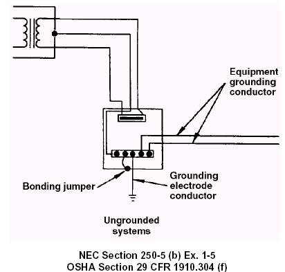 Figure 4-3. An ungrounded system does not have a grounded (neutral) conductor routed between the supply transformer and the service equipment because the supply transformer is not earth grounded.