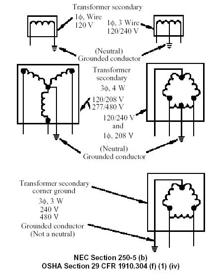 Alternating current systems of less than 50 volts shall be grounded as required in NEC Section 2505(a). Systems of 50 to 1,000 V should be solidly grounded as required by NEC Section 250-5. Systems supplying phase-to-neutral loads shall also be solidly grounded (See Figure 4-5). The following electrical systems are required to be solidly grounded: 1. 120/240-V, single-phase, three-wire 2. 208Y/120-V, three-phase, four-wire, 3. 480Y/277-V, three-phase, four-wire, 4. 120/240-V, three-phase, four-wire, delta. (Midpoint of one phase used as a grounded circuit conductor.) The following systems are not required to be solidly grounded: 1. 240-V, three-phase, three-wire, delta 2. 480-V, three-phase, three-wire 3. 600-V, three-phase, three-wire. These electrical systems do not supply phase to neutral loads. They supply only phase-to-phase loads.