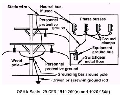 Figure 4-9. Equipotential personnel protective grounds are used to protect electrical workers while they service, repair, or are close to circuits that can be accidentally reenergized. 3. The following are factors that contribute to adequate capacity: a. Terminal strength depends on the ferrules installed on the cable ends b. Cross-sectional area to carry maximum current without melting c. Low resistance to keep voltage drop across the areas in which personnel are working at a safe level during any period to prevent reenergization. The voltage drop should not exceed 100 volts for 15 cycle or 75 volts for 30 cycle clearing times. d. Verify that the grounding cable and clamp assembly is tested periodically by using the millivolt drop, micro-ohm meter, AC resistance, or DC resistance test methods. For example, if it is desired to maintain a maximum of 100 volts across a worker whose body resistance is 1000 ohms, during a fault of 1000 amperes, a personnel protective ground resistance of 10 millohms or less is required. 4. For further information on the construction of personnel protective grounds, refer to ASTM F855-90, IEEE 524A, IEEE 1048, and Section 7.5. 4.15.3 GROUNDING CLAMPS Grounding clamps used in personnel protective grounds are manufactured specifically for this use. The size of grounding clamps shall match the size of conductor or switchgear bus being grounded. The ground clamp also shall be rated to handle the full capacity of the available fault currents. Fault currents can typically range in magnitude up to over 200,000 A. 4.15.4 SCREW-TIGHTENING DEVICES Approved screw-tightening devices designed for the purpose of pressure metal-to-metal contact are required for connections to an adequate system ground. 4.15.5 GROUNDING CABLE LENGTH Grounding cables should be no longer than is necessary, both to minimize voltage drop and to prevent violent movement under fault conditions. For example, as a general rule, grounding cables should not exceed 30 ft for a transmission line and 40 ft for substation use. 4.15.6 GROUNDING CABLE CONNECTION Grounding cables shall be connected between phases to the grounded structure and to the system neutral to minimize the voltage drop across the work area if the circuit should become inadvertently reenergized. Workers shall install the ground end clamp of a grounding cable first and remove it last. 4.15.7 CONNECTING GROUNDING CABLES IN SEQUENCE Grounding cables shall be connected to the ground bus, structure, or conductor first, then to the individual phase conductors. The first connection of the grounding cables to the circuit phase conductors shall be to the closest phase of the system and then to each succeeding phase in the order of closeness. 4.15.8 REMOVING PROTECTIVE GROUNDS When removing personnel protective grounds, reverse the order they were applied to the phases. The grounding cable conductors attached to the ground bus, structure, or conductors shall always be removed last. 4.15.9 PROTECTIVE APPAREL AND EQUIPMENT Protective apparel shall be worn when applying or removing grounds. An insulating tool (hot stick) shall be used to install and remove grounding cables. (See 29 CFR 1910.269(n)(6) and (7), 1926.954(e) and NESC Rule 445). Protective apparel (personnel protective equipment) should include at least the following: 1. Safety glasses and, if necessary, face shield appropriate for fault currents available. 2. Hardhat (Class B) (See 2.12.3) 3. Appropriate electrical gloves and protectors (See 2.12.3). 4. Appropriate clothing (See note in 2.11.3).