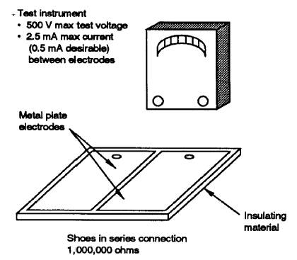 Figure 5-1. Testing shoes on wearer. 5.1.5.1 PERMANENT EQUIPMENT AND WIRING The NEC and this section are minimum requirements for DOE facilities containing explosives. Though the NEC does not specifically address explosives, Article 500, "Hazardous (Classified) Locations," does establish requirements for the design and installation of electrical equipment and wiring in locations containing combustible dusts and flammable liquids, vapors, or gases that in general are comparably hazardous. All permanent electrical equipment and wiring in work areas containing explosives hazards shall conform to the standards of the NEC Hazardous Locations Class II or Class I and II (dual rated). For Class II installations, provisions should be made for easy conversion to Class I.