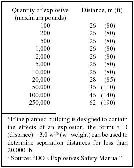 SYSTEMS There may be multiple hazards where explosives facilities are located near electrical supply lines. To protect against these hazards, the NESC (ANSI/IEEE C2) and the following requirements apply to all new construction or major modification and should be considered for existing facilities: 1. Electric lines serving explosive facilities shall be installed underground from a point not less than 50 ft from such facilities. This also applies to communications and instrumentation lines and security alarm systems. 2. Electric service lines required to be close to an explosives facility shall be no closer to that facility than the length of the lines between the poles or towers supporting the lines, unless an effective means is provided to ensure that broken, energized lines cannot come into contact with and present a hazard to the facility or its appurtenances. 3. Unmanned electrical substations shall be no closer to explosives facilities than public traffic route distances. 4. Electric transmission lines (carrying 69 kV or more) and the tower or poles supporting them shall be located not closer to explosives than: a. Inhabited-building distance if the line in question is part of a system serving a large, offsite area. b. Public traffic route distance if loss of the line shall not create serious social or economic hardships. c. Underground utility separation distance criteria found in Table 5-1. Table 5-1. Quantity-distance separation for protection of underground service installation a,b