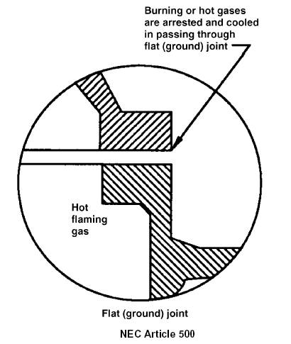Figure 5-5. Flat (ground) joints can be used as an escape path to cool the hot gases as they pass through the flat (ground) joint. In addition, door-interlock switches are required to prevent access to the equipment while the circuits are energized. All of these accessories can add up to a considerable expenditure. For a detailed description of purging/pressurizing systems see NFPA 496, "Purged and Pressurized Enclosures for Electrical Equipment in Hazardous Classified Locations."
