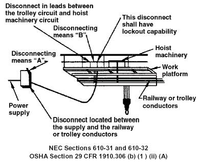 CRANES AND HOISTS The most significant factor in crane and hoist safety, after structural integrity, is electrical safety. All the referenced standards support this fact either directly or indirectly by the amount of definition and space provided for electrical systems' controls, operations, and maintenance. 6.2.1 NEC GENERAL REQUIREMENTS Basic installation and wiring safety requirements for cranes and hoists are given in NEC Article 6101. Electrical designers and maintenance personnel should thoroughly understand these requirements and their intent. Some of the more significant requirements are the following: 1. Cranes and hoists operated in hazardous (classified) locations shall conform to NEC Article 500. 2. When the crane is operated above readily combustible materials, the resistors must be located in a well-ventilated cabinet constructed of noncombustible material and constructed so that they will not emit flames or molten metal. See the exception (and requirements) that applies to certain cabinets made of noncombustible materials. 3. Cranes and hoists operating on electrolytic cell lines have special requirements, as given in NEC Section 668-32. a. Grounding is not required for conductive surfaces of cranes and hoists that enter the working zone of a cell line, and the parts that come in contact with an energized cell or attachments shall be insulated from ground. 1 See Appendix D, Reference Matrix. b. Remote controls that may introduce hazardous conditions into the cell line working zone shall employ one or more of the following: (1) Isolated and ungrounded control circuit in compliance with NEC Section 668-21 (a) (2) Nonconductive rope operator (3) Pendant pushbutton with either non-conductive support and surfaces or ungrounded exposed surfaces. (4) Radio 6.2.2 DISCONNECTING MEANS The disconnecting means provided for cranes and hoists may consist of two or more lock-open-type motor circuit switches or circuit breakers. Article 610, Part D, of the NEC, "Disconnecting Means," and the installation and operating plans should be studied carefully to determine the disconnecting means requirements and locations. The two basic disconnects to consider are: 1. The runway conductor (conductors run along a crane runway for power or control) disconnect which shall: a. Be readily accessible or operable from the ground or floor level per NEC Section 61031(1) b. Be lockable in the open position per NEC Section 610-31(2) c. Open all ungrounded conductors simultaneously per NEC Section 610-31(3) d. Be placed in view of the crane or hoist and the runway conductors per NEC Section 61031(4). 2. The crane and hoist disconnect which shall be provided in the leads from the runway contact conductors or other power supply unless all the following requirements are met: a. The unit is ground or floor level controlled per NEC Section 610-32, Exception b. The unit is within view of the power supply disconnecting means per NEC Section 61032, Exception c. No fixed work platform has been provided for servicing the unit per NEC Section 61032, Exception. See Figure 6-1 (a) and (b) for a detailed illustration of the rules pertaining to the disconnecting means for electric cranes and hoists.
