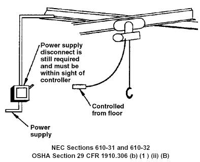 Figure 6-1(b). Second disconnect not required. A monorail hoist does not require a disconnecting means in the leads to the hoist machinery if it is controlled from the floor, if it is within view of the power supply disconnect, and if there is no work platform provided to service the hoist machinery.