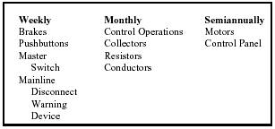 NEC grounding requirements consider the crane or hoist with all its associated equipment, including electrical equipment, as a single piece of equipment; therefore, all the conductive component parts shall be bonded together so that the entire crane or hoist is grounded in compliance with NEC Article 250, Part G, and NEC Section 610-61. Metal-to-metal contact is required between all surfaces including the trolley wheels and bridge. If any such surfaces are painted or otherwise insulated, a separate bonding conductor is required. The bonding of all conductive surfaces by metal-to-metal contact is not to be considered as the equipment grounding conductor for the electrical equipment (motors, motor controllers, lighting fixtures, transformers, etc.)on the crane or hoist. The equipment ground conductors that are run with the circuit conductors shall comply with NEC Section 250-91(b). 6.2.4 CONTROL A limit switch is required to prevent the load block from passing the safe upper travel limit on all hoisting mechanisms per NEC Section 610-55. 6.2.5 CLEARANCES In the direction of live parts, the working space clearance is 2-1/2 ft, and doors enclosing live parts that may require service or maintenance shall open at least 90 degrees or be removable per NEC Section 610-57. 6.2.6 OSHA AND NEC REQUIREMENTS 29 CFR 1910.179 and NEC Article 610, Part F, provide additional electrical requirements derived from ANSI and other standards. Significant requirements are the following: 1. Control circuit voltage shall not exceed 600 Vac or dc. Pendant pushbutton voltage shall not exceed 150 Vac or 300 Vdc. 2. Support shall be provided for pendant multiconductor cables. 3. Electrical systems for cranes and hoists shall provide failsafe operation. When power fails, all motors shall be automatically disconnected so that they will not resume operation when the power comes back on. Automatic cranes shall not commence motion automatically when the power comes on after an outage. Pendant pushbuttons shall be returned to the off position when pressure is released. When the signal from a remote controller fails, all motion shall stop. 6.2.7 MAINTENANCE AND OPERATIONS It is important to have a comprehensive electrical maintenance program for cranes and hoists. Every electrical part and circuit plays a critical operational safety role and must be checked and serviced at the frequency and in the manner specified by OSHA, CMAA, ANSI, and the manufacturer's manual. Required weekly, monthly, and semiannual tests and required recordkeeping are contained in ANSI B-30 and CMAA documents. The basic references for safe operation and maintenance of cranes and hoists are contained in the following sections of 29 CFR 1910 and 1926. 1. 29 CFR 1910.179, Overhead and Gantry Cranes, which addresses operations and maintenance requirements 2. 29 CFR 1910.306, Specific Purpose Equipment and Installations, which address electrical installation requirements 3. 29 CFR 1926.550 and 29 CFR 1926.554, which address construction site operations. 6.2.8 DOCUMENTED MAINTENANCE Maintenance checklists and schedules in compliance with OSHA, the owner's manuals, and the manufacturer's requirements for the specific equipment shall be provided as required. Weekly, monthly, and semiannual inspections shall be conducted, and comments and condition of the inspected part shall be documented and certified as required by 29 CFR 1910.179. The recommended frequencies of inspections vary in accordance with application, usage, and authority. Frequent inspection and periodic inspection are defined by OSHA as daily to monthly and 1 to 12 months, respectively. Typical inspection frequencies for electrical equipment of cranes and hoists are as follows: