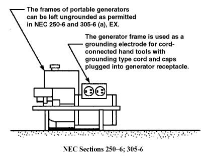 FIRE PROTECTION The electrical designer shall coordinate with the manufacturer the design of the fire protection systems that connect to the elevator control panel. The system will be designed to return the car to a designated area (normally the first floor or lobby) in the event of smoke or fire in the equipment area or near the elevators. In that event, the car returns to a designated area where passengers can safely exit the facility. In addition to coordinating car control, the system provides for the shutdown of the electrical elevator equipment prior to operation of the sprinklers and the transmission of the alarm and provides a means for the firefighters to assume manual control of the elevator from the designated area. The requirements for these systems are detailed in ANSI/ASME A17.1, Section 211, "Emergency Operation and Signaling Devices." 6.3.6 INSPECTIONS AND RECORDS Elevator inspections and recordkeeping are performed in accordance with the local authority having jurisdiction. The ANSI/ASME A17.2 series of inspectors manuals provide a guide for performing tests and inspections as well as recommended inspection checklists. In addition to acceptance inspections and tests, the code requires 1-and 5-year inspections for electric elevators and 1-and 3year inspections for hydraulic elevators. 6.3.6.1 CODES Elevators are required to be in compliance with the issue of ANSI/ASME A17.1 in force the date they were installed. If the local authority has adopted ANSI/ASME A17.3, the code for existing installations, they shall be in compliance with it, except they shall not be downgraded to it. When ANSI/ASME A17.3 is in force, it becomes the minimum standard to which installations shall adhere, and if existing installations are upgraded in accordance with ANSI/ASME A17.1, Part XII, they shall also be in compliance with the more stringent requirements of A17.3. 6.3.6.2 INSPECTOR QUALIFICATIONS Inspectors should meet the requirements of ANSUASME QEI-1 and be recognized by the local enforcing authority. Repair and maintenance personnel should be qualified elevator mechanics. 6.4 PORTABLE AND VEHICLE-MOUNTED GENERATORS Using portable and vehicle-mounted generators to operate electric tools on job sites is permitted under specific conditions by both NEC Section 305-6 and 29 CFR 1926.404(f)(3). However, OSHA inspections have disclosed a potentially serious hazard resulting from the use of portable generators. Both OSHA and the NEC permit the use of two-wire, single-phase generators of not more than 5,000 W "where the circuit conductors of the generator are insulated from the generator frame and all other grounded surfaces." Under these conditions, neither the receptacles, cord sets, nor tools need to be protected by GFCIs or an assured equipment grounding conductor program. This exception from using GFCIs is granted because with an insulated (isolated) circuit, there is no dangerous current flow from the generator-fed conductors to ground, structural steel, or any other grounded object. However, the use of GFCI devices is still recommended. If the circuit conductors are not isolated, however, the shock hazard would be the same as with any other electrical source and the exemption does not apply. All portable electric generators that supply 15-or 20-A, 120-V receptacles and that are in use or are available for use on construction sites shall meet all the following conditions or be used only with either GFCIs or an assured equipment grounding conductor program. 1. They must be rated not more than 5 kW. 2. They shall have only a two-wire circuit (i.e., only 120-V output). 3. They shall have both circuit conductors insulated from the frame and all other grounded surfaces. See NEC Section 250-6 and Figure 6-3. 6.5 BATTERIES Storage batteries are considered a live source and appropriate precautions should be taken when working around them. 6.5.1 SURROUNDING SPACE Adequate space should be provided around storage batteries for safe inspection, maintenance, testing, and cell replacement. Space shall be left above cells to allow for operation of lifting equipment when required, for addition of water, and for taking measurements.