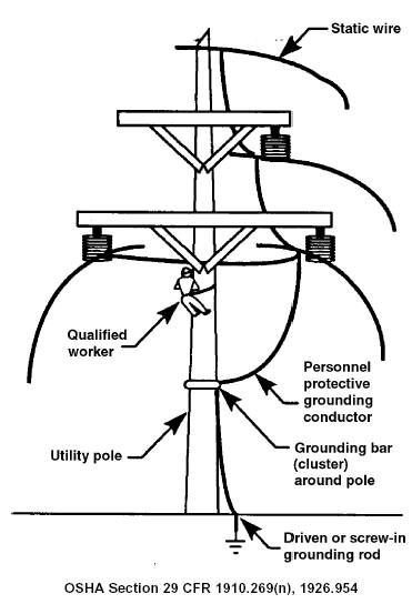 LINES AND EQUIPMENT Grounding is the most effective way of protecting electrical workers from electric shock. That is why it is important to ensure that all deenergized lines and equipment are grounded. (See Sections 4.5.2, 7.5.3, Figure 7-2,29 CFR 1910.269(n),1926.954, and IEEE 1048-1990, "IEEE Guide for Protective Grounding for Power Lines.") 7.5.1 PURPOSE This section provides information concerning protection for workers repairing, servicing, or working on high-voltage power lines. (See 29 CFR 1910.269(n), 1926.954, and ASTM F-855.)