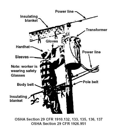 Figure 7-3. Employees using special tools for climbing and for servicing high-voltage systems shall be trained on how to use such tools and equipment. 7.7.1 LINEWORKER'S CLIMBING TOOLS Employees should apply the following: 1. All climbers should be inspected frequently by the worker using them. 2. Climber gaffs should be kept sharp. 3. A climber shall not be used when its gaff becomes shorter than 1-1/4 in. inside measurement. 4. Climber straps that are worn or otherwise defective shall be replaced. 7.7.2 BODY BELTS AND SAFETY STRAPS Employees using body belts and safety straps (work positioning equipment) should apply the following: 1. All body belts and safety straps shall be inspected before each use by the employee who uses them. 2. Workers shall use their body belts and safety straps when doing any work involving danger of falling. 3. Body belts and safety straps should not be stored with unguarded sharp tools or devices. 4. Heat, sharp bends, and overstressing of body belts and safety straps should be avoided as they are injurious to leather. Wet leather should be dried slowly at moderate temperatures. See 29 CFR 1910.67, 1910.269(a), 1926.500, and 1926.502 for further information. 7.7.3 TOOL BAG AND EQUIPMENT Tools, small equipment, and materials should be raised and lowered in a tool bag. The tool bag should be inspected before use to see that it contains no broken glass or other material on which the employee could cut his or her hand or rubber gloves. Tool bags should not have any metal in their construction. 7.7.4 TAPES AND RULERS Workers should not use metal measuring tapes or tapes having metal strands woven into the fabric, brass bound rules, or metal scales when working near electrical equipment or conductors [See NESC Rules 420C(6) and 443A(6)]. 7.7.5 SPOON AND SHOVELS Tools of this type, especially those having long wooden handles, shall not be used when the handles are cracked, split, or broken. 7.7.6 PIKE POLES Pike poles shall comply with the following: 1. Cracked, broken, or slivered pike poles should not be used; 2. Pike poles should not be thrown; and 3. When not in use and loaded on the truck, the points should be protected so that they will not injure anyone. 7.7.7 HAND AXES AND SHARP TOOLS Hand axes and sharp tools shall comply with the following: 1. Hand axes should not be used on overhead work; and 2. When not in use, sharp tools should be protected by the suitable guards or containers. 7.7.8 HANDLINES AND TAGLINES Use high quality, nonconductive handlines and taglines. Keep them stored in a clean, dry location and protected from damage and contamination. Wear clean gloves when handling handlines and taglines to avoid contaminating the rope. Remove wet, dirty, or damaged ropes from service.