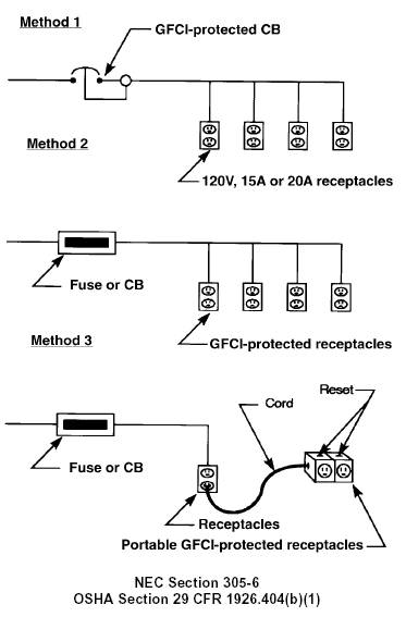 Figure 2-2. There are three methods of providing GFCI protection for construction sites. 4. Procedures on how to perform their jobs safely and properly. 5. How to lockout/tagout energized electrical circuits and equipment safely. 29 CFR 1910.269(a) and 1910.332 also require training for persons other than qualified workers, if job assignments bring them close enough to exposed parts of electrical circuits operating at 50 V or more to ground for a hazard to exist. Other types of training recommended for electrical workers include the following: a. National Electrical Code (NFPA 70) b. National Electrical Safety Code (ANSI C2) c. Use of personal protective grounds-29 CFR 1910.269(n), 1926.954(e), NESC Rule 445, and NFPA 70E, Part II, Ch. 2-4. d. Use of testing and measuring equipment-29 CFR 1910.269(o) and 1910.334(c) e. Work permit and work authorization procedures f. Use and care of personal protective equipment-29 CFR 1910.2690) and 1910.335(a) g. Proper clothing required for arc blast protection-29 CFR 1910.269(1) and NFPA 70E Part II Ch. 2-3.3 h. First aid and CPR-29 CFR1910.269(b) and 70E Part II, Ch. 2-1.3. Refresher training is recommended at intervals not to exceed 3 years (see OSHA Instruction CPL 2-2.53).