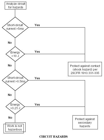 10.8.1.1 HAZARDS 1. Internal component failure can cause excessive voltages. Internal component open-circuit failure in capacitor banks and Marx generators can result in full voltages across components that may not be appropriately discharged in the usual manner. 2. Internal component shorts in capacitor banks and Marx generators can result in excessive fault current, causing extreme heat, overpressurization of capacitor cans, and explosion. 3. Overloading or improper cooling of power supplies can cause excessive temperature rise. 4. Output circuits and components can remain energized after input power is interrupted. 5. Auxiliary and control power circuits can remain energized after the main power circuit is interrupted. 6. When power supplies serve more than one experiment, errors made when switching between experiments may create hazards to personnel. 7. R&D electrical apparatus may contain large amounts of stored energy, requiring fault analysis. 8. Liquid coolant leaking from R&D electrical equipment may pose an electrical hazard to personnel. 10.8.1.2 DESIGN AND CONSTRUCTION In design and construction of R&D equipment, it is important to remember the following cautions: 1. Install only components essential to the power supply within the power-supply enclosure. 2. Provide appropriate separation between high-voltage components and low-voltage supply and/or control circuits. 3. Provide to personnel a visible indicator that the power supply is energized. 4. Minimize the number of control stations and provide an emergency shutdown switch where needed. 5. Where possible, avoid multiple-input power sources. 6. Apply a label containing emergency shutdown instructions to equipment that is remotely controlled or unattended while energized. 10.8.1.3 OPERATION AND MAINTENANCE Before working in a power-supply enclosure or an associated equipment enclosure, see Sections 2 and 7. Personnel should take the following precautions: 1. Implement lockout/tagout. 2. Check for auxiliary power circuits that could still be energized. 3. Inspect automatic shorting devices to verify proper operation. 4. Short the power supply from terminal to terminal and terminal to ground with grounding hooks. 10.8.2 CONDITIONS OF LOW VOLTAGE AND HIGH CURRENT 10.8.2.1 HAZARDS It is usual for R&D facilities to have equipment that operates at less than 50 V. Although this equipment is generally regarded as nonhazardous, it is considered hazardous when high currents are involved. Examples of such equipment are a power supply rated 3 kA at 25 V, a magnet power supply with rated output of 200 A at 40 V, and a bus bar carrying 1 kA at 5 V. Though there is a low probability of electric shock at voltages less than 50V (See Figure 10-1), there is a hazard due to arcing and heating in case of an accidental fault. For example, a tool could drop onto the terminals and initiate an arc, causing severe burns.