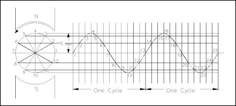 GENERATION ANALYSIS Analysis of the AC power generation process and of the alternating current we use in almost every aspect of our lives is necessary to better understand how AC power is used in today's technology. EO1.3 DEFINE the following terms in relation to AC generation: a. Radians/second b. Hertz c. Period EO 1.4DEFINE effective value of an AC current relative to DC current. EO 1.5Given a maximum value, CALCULATE the effective (RMS) and average values of AC voltage. EO 1.6Given a diagram of two sine waves, DESCRIBE the phase relationship between the two waves. Effective Values The output voltage of an AC generator can be expressed in two ways. One is graphically by use of a sine wave (Figure 3). The second way is algebraically by the equation e = Emax,sin cot, which will be covered later in the text.