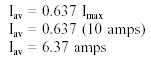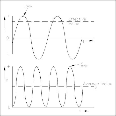 Figure 4 Effective Value of Current Another useful value is the average value of the amplitude during the positive half of the cycle. Equation (7-7) is the mathematical relationship between Iav, Imax , and I.