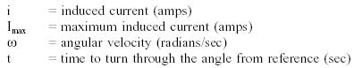 maximum induced EMF (volts) angular velocity (radians/sec) time to turn through the angle from reference (sec) Current Calculations Maximum induced current is calculated in a similar fashion. Equation (7-12) is a mathematical representation of the relationship between the maximum induced current and the angular velocity.