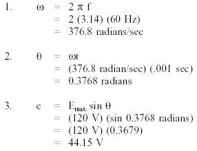 Example 1: The frequency of a 120 V AC circuit is 60 Hz. Find the following: 1. Angular velocity 2. Angle from reference at 1 msec 3. Induced EMF at that point Solution: