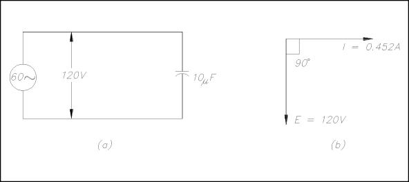 Current (I) leads applied voltage by 90 in a purely capacitive circuit. The phasor diagram shows the applied voltage (E) vector leading (below) the current (I) vector by the amount of the phase angle differential due to the relationship between voltage and current in a capacitive circuit.