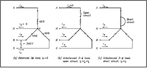 16 3 Find line current and neutral current for the following load conditions. 1. balanced load 2. open circuit phase A (Figure 16b) 3. short circuit in phase A (Figure 16c)