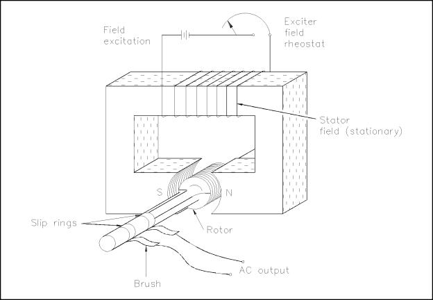 Figure 1 Basic AC Generator Stator The stator of an AC generator is the part that is stationary (refer to Figure 1). Like the rotor, this component may be the armature or the field, depending on the type of generator. The stator will be the armature if the voltage output is generated there; the stator will be the field if the field excitation is applied there.