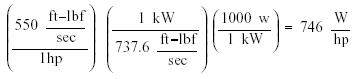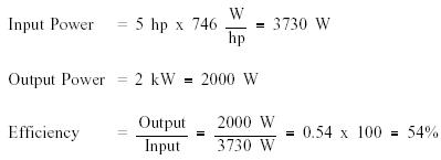 Example: Given a 5 hp motor acting as the prime mover of a generator that has a load demand of 2 kW, what is the efficiency of the generator? Solution: In order to calculate efficiency, the input and output power must be in the same units. As described in Thermodynamics, the horsepower and the watt are equivalent units of power. Therefore, the equivalence of these units is expressed with a conversion factor as follows.