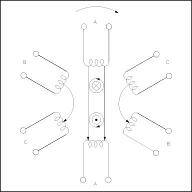 When alternating current is applied to the stator windings of an AC induction motor, a rotating magnetic field is developed. The rotating magnetic field cuts the bars of the rotor and induces a current in them due to generator action. The direction of this current flow can be found using the left-hand rule for generators. This induced current will produce a magnetic field, opposite in polarity of the stator field, around the conductors of the rotor, which will try to line up with the magnetic field of the stator. Since the stator field is rotating continuously, the rotor cannot line up with, or lock onto, the stator field and, therefore, must follow behind it (Figure 3).