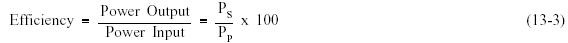 where NP= number of turns in the primary NS= number of turns in the secondary ZP= impedance of primary ZS= impedance of secondary Efficiency Efficiency of a transformer is the ratio of the power output to the power input, as illustrated by Equation (13-3).
