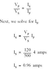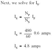 Example 2: A transformer with 480 turns on the primary and 60 turns on the secondary draws 0.6 amps from a 120 V line. Find Is. Solution: