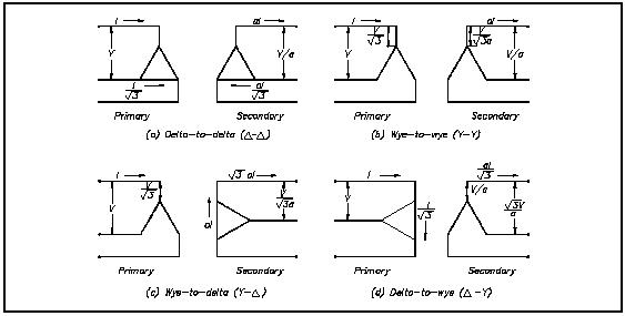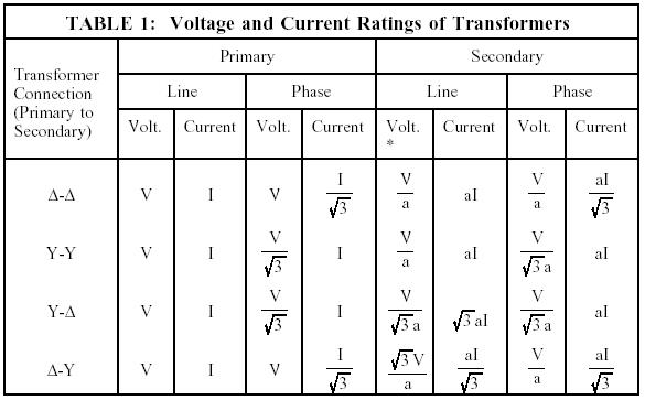 Figure 5 30 Transformer Connections Figure 5 shows the voltages and currents in terms of applied line voltage (V) and line current (1), where the turns ratio (a) is equal to one. Voltage and current ratings of the individual transformers depend on the connections (Figure 5) and are indicated by Table 1 for convenience of calculations.