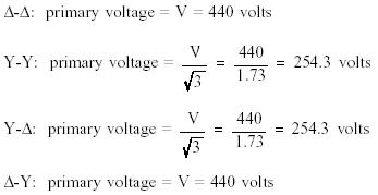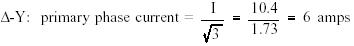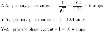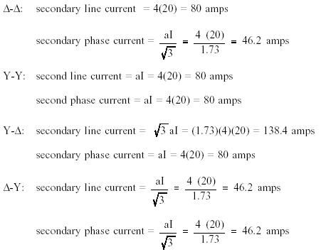 Example 3: Find the secondary line current and phase current for each type of transformer connection, if primary line current is 20 amps, and the turns ratio is 4:1.