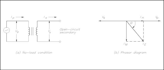 Operation Under No-Load If the secondary of a transformer is left open-circuited (Figure 6), primary current is very low and is called the no-load current. No-load current produces the magnetic flux and supplies the hysteresis and eddy current losses in the core. The no-load current (IE) consists of two components: the magnetizing current (I.) and the core loss (IH). Magnetizing current lags applied voltage by 90, while core loss is in phase with the applied voltage (Figure 6b). Vp and Vsare shown 180 out of phase. IH is very small in comparison with Im, and Im is nearly equal to IE.No-load current, IE,is also referred to as exciting current.