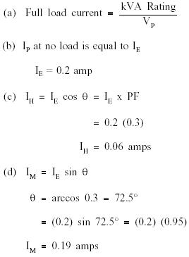 Figure 6 Open-Circuit Secondary Example: When the secondary of a 120/440 V transformer is open, primary current is 0.2 amps at a PF of .3. The transformer is a 5 kVA transformer. Find: (a) IP, (b) IE, (c) IH, and (d) Im