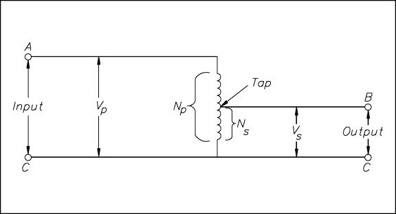 Figure 8 Auto Transformer Schematic Isolation Transformer Isolation transformers are normally low power transformers used to isolate noise from or to ground electronic circuits. Since a transformer cannot pass DC voltage from primary to secondary, any DC voltage (such as noise) cannot be passed, and the transformer acts to isolate this noise. Instrument Potential Transformer The instrument potential transformer (PT) steps down voltage of a circuit to a low value that can be effectively and safely used for operation of instruments such as ammeters, voltmeters, watt meters, and relays used for various protective purposes. Instrument Current Transformer The instrument current transformer (CT) steps down the current of a circuit to a lower value and is used in the same types of equipment as a potential transformer. This is done by constructing the secondary coil consisting of many turns of wire, around the primary coil, which contains only a few turns of wire. In this manner, measurements of high values of current can be obtained. A current transformer should always be short-circuited when not connected to an external load. Because the magnetic circuit of a current transformer is designed for low magnetizing current when under load, this large increase in magnetizing current will build up a large flux in the magnetic circuit and cause the transformer to act as a step-up transformer, inducing an excessively high voltage in the secondary when under no load. Summary The important information covered in this chapter is summarized below. Transformer Types Summary Distribution transformers are generally used in power distribution and transmission systems. Power transformers are used in electronic circuits and come in many different types and applications. Control transformers are generally used in circuits that require constant voltage or constant current with a low power or volt-amp rating. Auto transformers are generally used in low power applications where a variable voltage is required. Isolation transformers are normally low power transformers used to isolate noise from or to ground electronic circuits. Instrument potential and instrument current transformers are used for operation of instruments such as ammeters, voltmeters, watt meters, and relays used for various protective purposes.