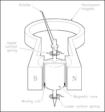 There are three basic meter movements utilized in electrical meters: D'Arsonval, electrodynamometer, and the moving iron vane. Some meter movements can be used for both AC or DC measurements, but in general, each meter movement is best suited for a particular type. EO 1.1EXPLAIN the following meter movements: a. D'Arsonval b. Electrodynamometer c. Moving iron vane D'Arsonval Movement The most commonly used sensing mechanism used in DC ammeters, voltmeters, and ohm meters is a current-sensing device called a D'Arsonval meter movement (Figure 1). The D'Arsonval movement is a DC moving coil-type movement in which an electromagnetic core is suspended between the poles of a permanent magnet. The current measured is directed through the coils of the electromagnet so that the magnetic field produced by the current opposes the field of the permanent magnet and causes rotation of the core. The core is restrained by springs so that the needle will deflect or move in proportion to the current intensity. The more current applied to the core, the stronger the opposing field, and the larger the deflection, up to the limit of the current capacity of the coil. When the current is interrupted, the opposing field collapses, and the needle is returned to zero by the restraining springs. The limit of the current that can be applied to this type movement is usually less than one milliampere.