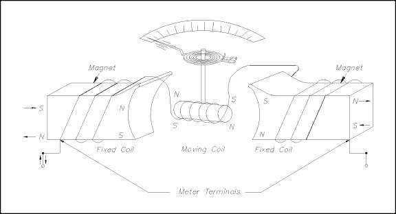 Movement The electrodynamometer movement (Figure 2) has the same basic operating principle as the D'Arsonval meter movement, except that the permanent magnet is replaced by fixed coils. The moving coil and pointer, which are attached to the coil, are suspended between and connected in series with the two field coils. The two field coils and moving coil are connected in series such that the same current flows through each coil.