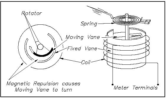 Iron Vane Movement The moving iron vane movement (Figure 3) can be used to measure both AC current and voltage. By changing the meter scale calibration, the movement can be used to measure DC current and voltage. The moving iron vane meter operates on the principle of magnetic repulsion between like poles. The measured current flows through a field coil which produces a magnetic field proportional to the magnitude of current. Suspended in this field are two iron vanes attached to a pointer. The two iron vanes consist of one fixed and one moveable vane. The magnetic field produced by the current flow magnetizes the two iron vanes with the same polarity regardless of the direction of current through the coil. Since like poles repel one another, the moving iron vane pulls away from the fixed vane and moves the meter pointer. This motion exerts a force against a spring. The distance the moving iron vane will travel against the spring depends on the strength of the magnetic field. The strength of the magnetic field depends on the magnitude of current flow.