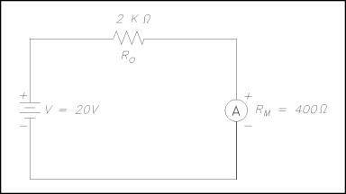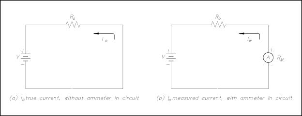 Figure 6 Ammeter When an ammeter is placed in series with a circuit, it will increase the resistance of that circuit by an amount equal to the internal resistance of the meter Rm. Equation (14-3) is the mathematical representation of the current without the meter installed.