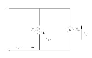 An ammeter with a full scale Im can be shunted with a resistor RSH in order to measure currents in excess of Im (Figure 8). The reason for shunting an ammeter is to extend the range of the ammeter and, thereby, measure currents higher than the original full scale value. By Kirchhoff's current law,