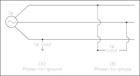 Figure 15 Three-Phase To Single-Phase Connections The first scheme (Figure 15A) provides for the connection of the load from a phase leg to any ground point and is referred to as a phase-to-ground scheme. The remaining scheme (Figure 15B) connects the single-phase load between any two legs of the three-phase source and is referred to as a phase-to-phase connection. The choice of schemes, phase-to phase or phase-toground, allows several voltage options depending on whether the source three-phase system is a delta or wye configuration. This will be discussed in the three-phase segment of this chapter. The only approved method of wiring single-phase power is the scheme commonly referred to as the 3-wire, single-phase Edison system. The illustration in Figure 16 depicts the use of a centertapped transformer, with the center tap grounded, providing half voltage (120 V) connections on either side or full voltage (240 V) across both sides.