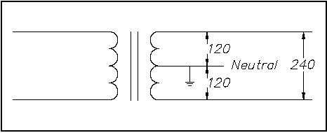 Figure 16 3-Wire Edison Scheme The physical connections to the transformer secondary involve two insulated conductors and one bare conductor. If the conductor is a current-carrying leg or neutral leg, the conductor will be insulated. The remaining uninsulated conductor will serve as a safety ground and will be bonded to the ground point of the system. In all cases, 3 wires will be presented to the load terminals, and the safety ground will be bonded to each junction box, or device, in the distribution system. In the case of half voltage (120 V) use, the intended path of the current is from the supply leg through the load and back to the source on the neutral leg. No current would be carried on the ground unless a fault occurred in the system, in which case the current would flow safely to ground. In the full voltage system (240 V), the insulated conductors are connected across the full winding of the transformer, and the uninsulated conductor is again bonded to the grounded center tap. In a balanced system, all currents will flow on the insulated conductors, and the grounded neutral will carry no current, acting only in a ground capacity. In the case of either an unbalanced load or a fault in the system, the bare conductor will carry current, but the potential will remain at zero volts because it is tied to the ground point. As in the case of the half voltage system, the uninsulated conductor will be bonded to each device in the system for safety.