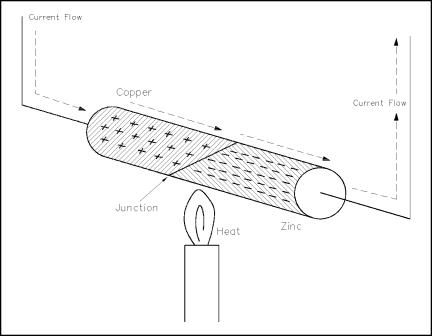 Some materials readily give up their electrons and others readily accept electrons. For example, when two dissimilar metals like copper and zinc are joined together, a transfer of electrons can take place. Electrons will leave the copper atoms and enter the zinc atoms. The zinc gets a surplus of electrons and becomes negatively charged. The copper loses electrons and takes on a positive charge. This creates a voltage potential across the junction of the two metals. The heat energy of normal room temperature is enough to make them release and gain electrons, causing a measurable voltage potential. As more heat energy is applied to the junction, more electrons are released, and the voltage potential becomes greater, as shown in Figure 15. When heat is removed and the junction cools, the charges will dissipate and the voltage potential will decrease. This process is called thermoelectricity. A device like this is generally referred to as a "thermocouple." The thermoelectric voltage in a thermocouple is dependent upon the heat energy applied to the junction of the two dissimilar metals. Thermocouples are widely used to measure temperature and as heat-sensing devices in automatic temperature controlled equipment.