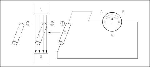 Induction Electromagnetic induction was discovered by Michael Faraday in 1831. Faraday found that if a conductor "cuts across" lines of magnetic force, or if magnetic lines of force cut across a conductor, a voltage, or EMF, is induced into the conductor. Consider a magnet with its lines of force from the North Pole to the South Pole (Figure 29). A conductor C, which can be moved between the poles of the magnet, is connected to a galvanometer G, which can detect the presence of voltage, or EMF. When the conductor is not moving, zero EMF is indicated by the galvanometer. If the conductor is moving outside the magnetic field at position 1, zero EMF is still indicated by the galvanometer. When the conductor is moved to position 2, the lines of magnetic force will be cut by the conductor, and the galvanometer will deflect to point A. Moving the conductor to position 3 will cause the galvanometer to return to zero. By reversing the direction in which the conductor is moved (3 to 1), the same results are noticed, but of opposite polarity. If we hold the conductor stationary in the magnetic lines of force, at position 2, the galvanometer indicates zero. This fact shows that there must be relative motion between the conductor and the magnetic lines of force in order to induce an EMF.