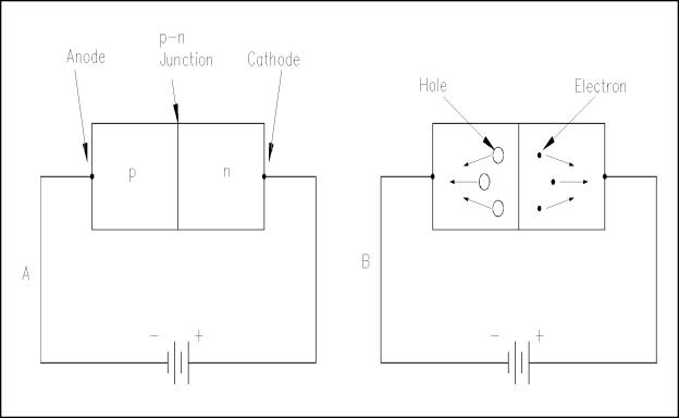 Reverse biasing occurs when the diode's anode is connected to the negative side of the source, and the cathode is connected to the positive side of the source (Figure 5A). Holes within the p-type material are attracted toward the negative terminal, and the electrons in the n-type material are attracted to the positive terminal (Figure 5B). This prevents the combination of electrons and holes near the p-n junction, and therefore causes a high resistance to current flow. This resistance prevents current flow through the circuit.