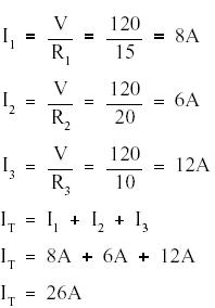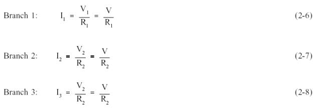 The sum of the currents flowing through each branch of a parallel circuit is equal to the total current flow in the circuit. Using Ohm's Law, the branch current for a three branch circuit equals the applied voltage divided by the resistance as shown in equations (2-6), (2-7), and (2-8).