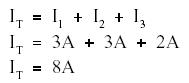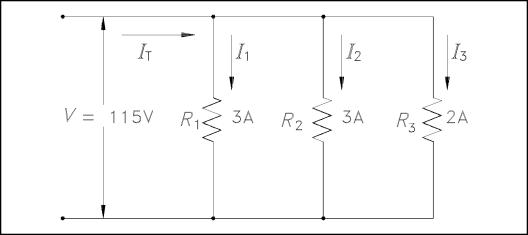 Example 1: Two resistors, each drawing 3A, and a third resistor, drawing 2A, are connected in parallel across a 115 volt source (Figure 23). What is total current?