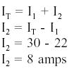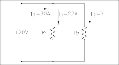 Example 2: Two branches, Rl and R2,are across a 120 V power source. The total current flow is 30 A (Figure 24). Branch Rl takes 22 amps. What is the current flow in Branch R2?