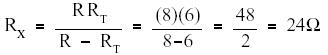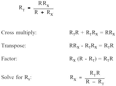 In certain cases involving two resistors in parallel, it is useful to find an unknown resistor, RX, to obtain a certain RT. To find the appropriate formula, we start with equation (2-10) and let the known resistor be R and the unknown resistor be RX.