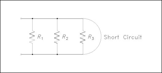 Figure 56 Shorted DC Circuit A short circuit is said to exist if the circuit resistance is so low that current increases to a point where damage can occur to circuit components. With an increase in circuit current flow, the terminal voltage of the energy source will decrease. This occurs due to the internal resistance of the energy source causing an increased voltage drop within the energy source. The increased current flow resulting from a short circuit can damage power sources, burn insulation, and start fires. Fuses are provided in circuits to protect against short circuits. Short Circuit (Parallel) When a parallel circuit becomes short circuited, the same effect occurs as in a series circuit: there is a sudden and very large increase in circuit current (Figure 57).