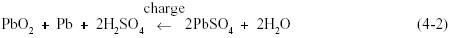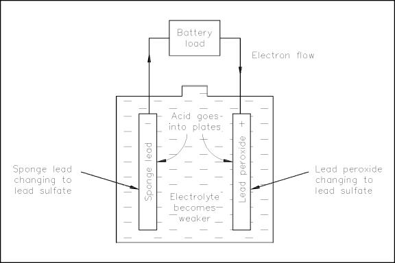 As a lead-acid battery is charged in the reverse direction, the action described in the discharge is reversed. The lead sulphate (PbS04) is driven out and back into the electrolyte (H2SO4). The return of acid to the electrolyte will reduce the sulphate in the plates and increase the specific gravity. This will continue to happen until all of the acid is driven from the plates and back into the electrolyte, as shown in Equation (4-2) and Figure 5.