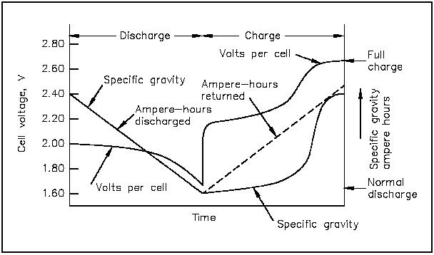 Figure 6 Voltage and Specific Gravity During Charge and Discharge The electrolyte in a lead-acid battery plays a direct role in the chemical reaction. The specific gravity decreases as the battery discharges and increases to its normal, original value as it is charged. Since specific gravity of a lead-acid battery decreases proportionally during discharge, the value of specific gravity at any given time is an approximate indication of the battery's state of charge. To determine the state of charge, compare the specific gravity, as read using a hydrometer, with the full charge value and the manufacturer's published specific gravity drop, which is the decrease from full to nominal charge value. Example: A lead-acid battery reads 1.175 specific gravity. Its average full charge specific gravity is 1.260 and has a normal gravity drop of 120 points (or. 120) at an 8 hour discharge rate. Solution: Fully charged - 1.260 Present charge - 1.175 The battery is 85 points below its fully charged state. It is therefore about 85/120, or 71%, discharged. Summary Battery theory is summarized below. Battery Theory Summary The purpose of a battery is to store chemical energy and to convert this chemical energy into electrical energy when the need arises. A voltaic cell develops a potential difference when electrodes of two different metals are immersed in an electrolyte. One electrode accumulates a positive charge. The potential difference is due to the difference in charge between the two electrodes. The chemical equation for a lead-acid battery during discharge is: