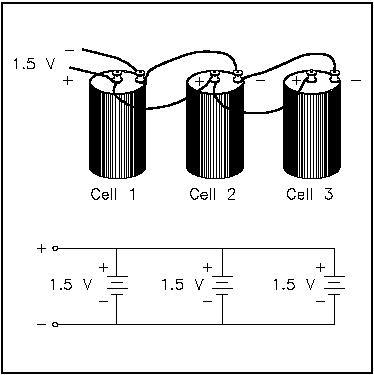 Figure 8 Cells Connected in Parallel Cells that cannot be returned to good condition, or recharged after their voltage output has dropped to a value that is not usable, are called primary cells. Dry cells that are used in flashlights and transistor radios (e.g., AA cells, C cells) are examples of primary cells.