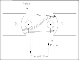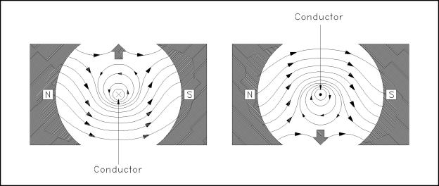 of Operation Every current-carrying conductor has a magnetic field around it. The direction of this magnetic field may be found by using the left-hand rule for current-carrying conductors. When the thumb points in the direction of current flow, the fingers will point in the direction of the magnetic field produced, as shown in Figure 1. If a current-carrying conductor is placed in a magnetic field, the combined fields will be similar to those shown in Figure 2. The direction of current flow through the conductor is indicated with an "x" or a ".". The "x" indicates the current flow is away from the reader, or into the page. The "." indicates the current flow is towards the reader, or out of the page.