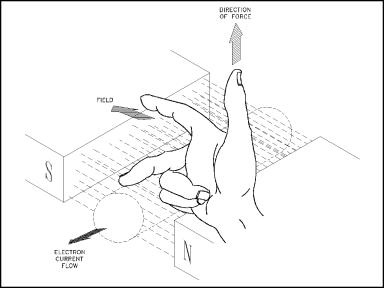 Figure 4 Right-Hand Rule for Motors The right-hand rule for motors shows the direction in which a current-carrying conductor moves in a magnetic field. When the forefinger is pointed in the direction of the magnetic field lines, and the center finger is pointed in the direction of current flow, the thumb will point in the direction of force (motion).